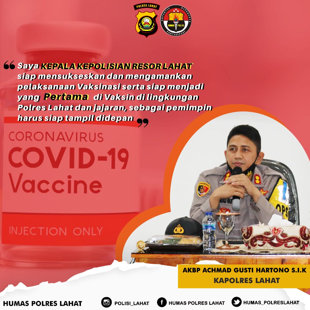 “Saya Kepala Kepolisian Resor Lahat, siap mensukseskan dan mengamankan pelaksanaan vaksinasi, serta siap menjadi orang pertama di lingkungan Polres Lahat dan jajaran untuk divaksin”, kata Kapolres Lahat tanpa ragu, Rabu (13/1/2021) via pesan singkat di WhatAppnya.