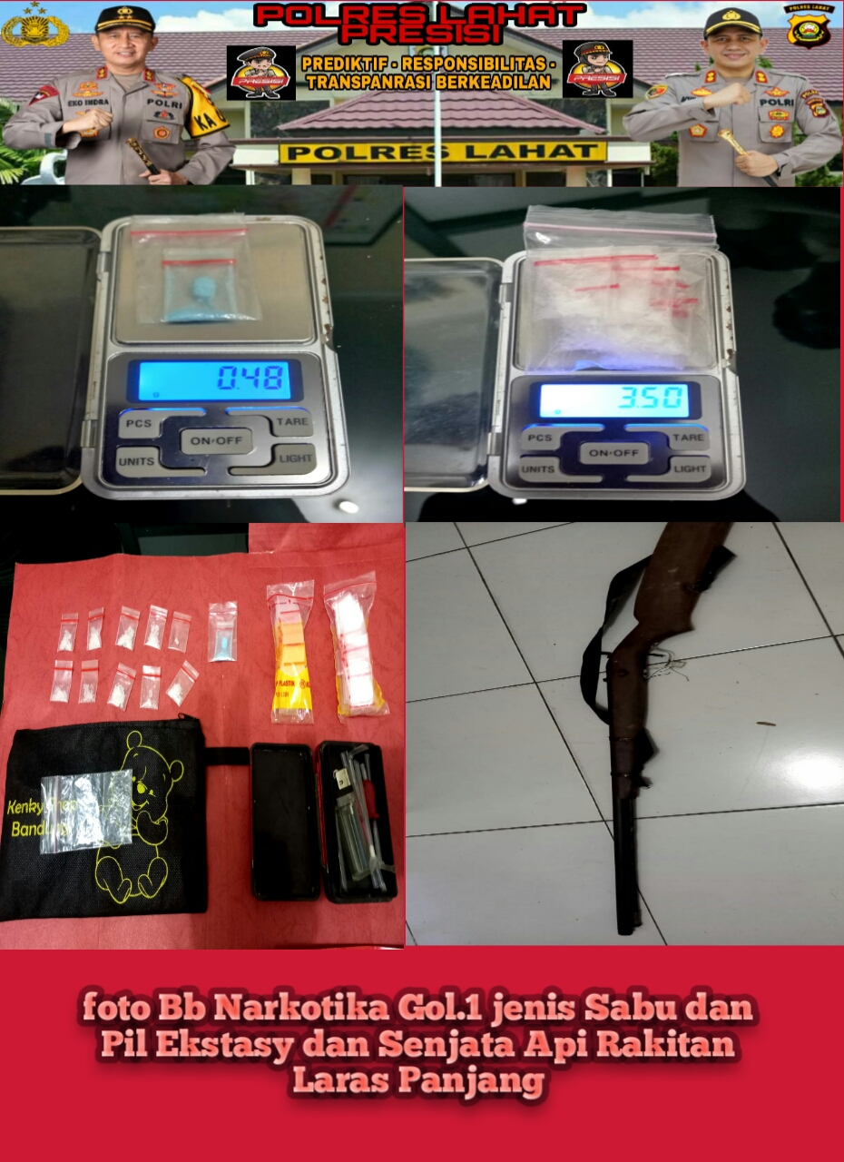 “Ketika petugas melakukan penyisiran didapati 1 (satu) buah senjata api rakitan laras panjang, yang diakui milik tersangka kepemilikannya namun, tidak dijelaskan untuk apa kegunaannya. Adapun barang bukti yang dicari berhasil ditemukan petugas, berupa: 10 (sepuluh) paket kecil serbuk kristal putih seberat 3,50 (tiga koma lima puluh) gram terbungkus plastik bening, kemudian ditemukan juga 1 (satu) butir pil tablet berwarna biru dan serbuk yang juga berwarna biru diduga narkotika jenis ekstasi seberat 0,48 (nol koma empat puluh delapan) gram, adapun temuan lain diantaranya, 2 (dua) bal plastik klip transparan, 1 (satu) set alat hisap shabu (bong), 1 (satu) buah dompet warna hitam dan 1 (satu) buah kaleng rokok warna merah.” Tambahnya.