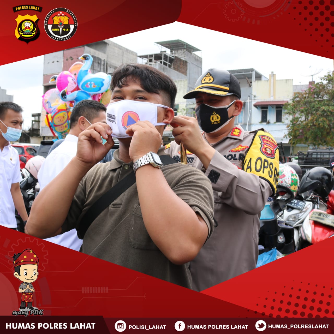 Dalam pelaksanaan kegiatan ini sebagai rasa tanggung jawab baik sebagai pimpinan maupun rasa kemanusiaan Kapolres Lahat turun langsung ke lapangan bersama dengan anggota untuk membagikan masker dan memberikan imbauan secara langsung kepada masyarakat, agar mematuhi protokol kesehatan yang sudah di tentukan pemerintah.