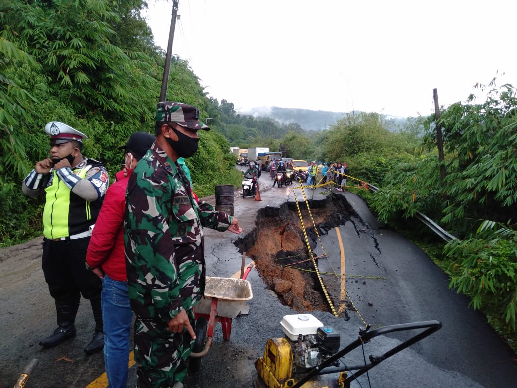 “Amblasnya jalan tersebut diperkirakan mencapai 20 meter dengan kedalaman mencapai 3 Meter. Indikasi sementara penyebab terjadinya longsor adalah kondisi tanah yang sudah retak ditambah dengan curah hujan deras”. jelas Ananta .
