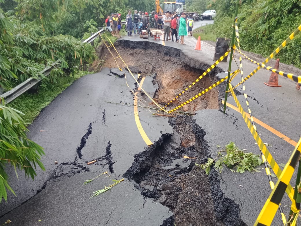 “Amblasnya jalan tersebut diperkirakan mencapai 20 meter dengan kedalaman mencapai 3 Meter. Indikasi sementara penyebab terjadinya longsor adalah kondisi tanah yang sudah retak ditambah dengan curah hujan deras”. jelas Ananta .