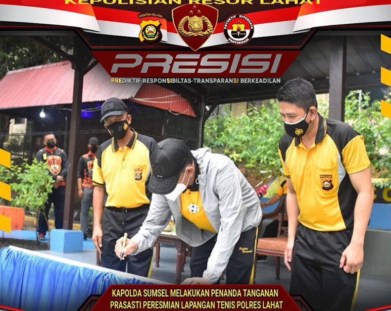 Diterangkan Iptu Hidayat, Kapolda Sumsel bersama Wakapolda didampingi Kapolres Lahat AKBP Achmad Gusti Hartono, S.I.K melakukan Penandatanganan Prasasti Peresmian Lapangan Tenis Polres Lahat.