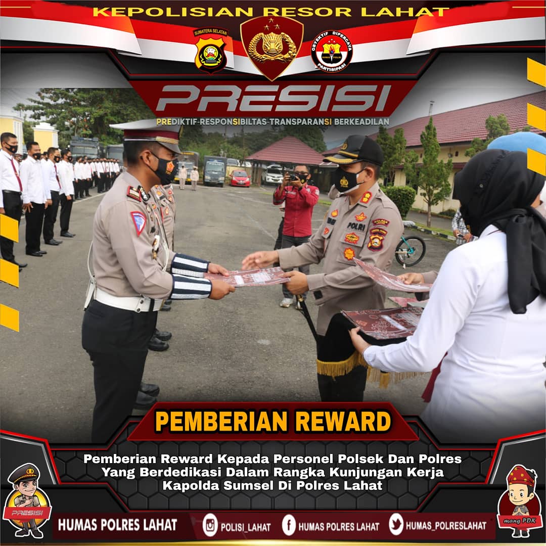 “Dalam giat kali ini kita akan berikan penghargaan kepada 76 Anggota Personel yang Berprestasi dan berdedikasi dalam memajukan instansi Kepolisian (Polri). Yang mana, prestasi-prestasi tersebut adalah dalam hal upaya pembangunan gedung baru dan renovasi gedung lama diantaranya; Gedung Serbaguna Jendral M. Hasan, Pembangunan 2 (dua) unit rumah dinas di Polsek Kikim Tengah. Kemudian Berprestasi dalam melestarikan situs religi keluarga Raden Patah serta pembangunan Musholla Mang PeDeKa di Desa Pagar Batu Kecamatan Pulau Pinang Kab. Lahat, Berprestasi dalam internalisasi pesan-pesan Kapolda Sumsel yang diwujudkan dalam Prasasti Pesan-pesan Kapolda Sumsel di halaman Mapolres Lahat. Berprestasi dalam pelestarian lingkungan serta menunjukkan semangat juang dalam pendakian Bukit Serelo Kabupaten Lahat dengan aman dan terakhir Berprestasi dalam input terbanyak pada aplikasi Polisiku Internal,” terang Kapolres.