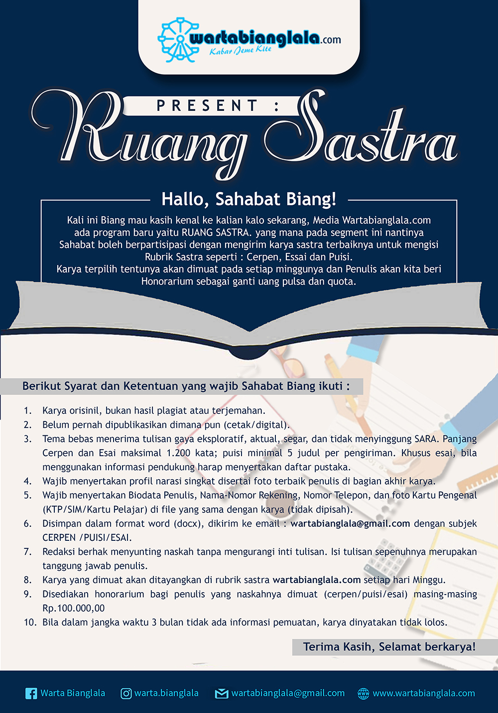 Kami membuka rubrik baru bertajuk Ruang Sastra untuk para pembaca sekalian. Kami membuka seluas-luasnya tulisan yang ingin dikirim, dengan ketentuan-ketentuan sebagai berikut :