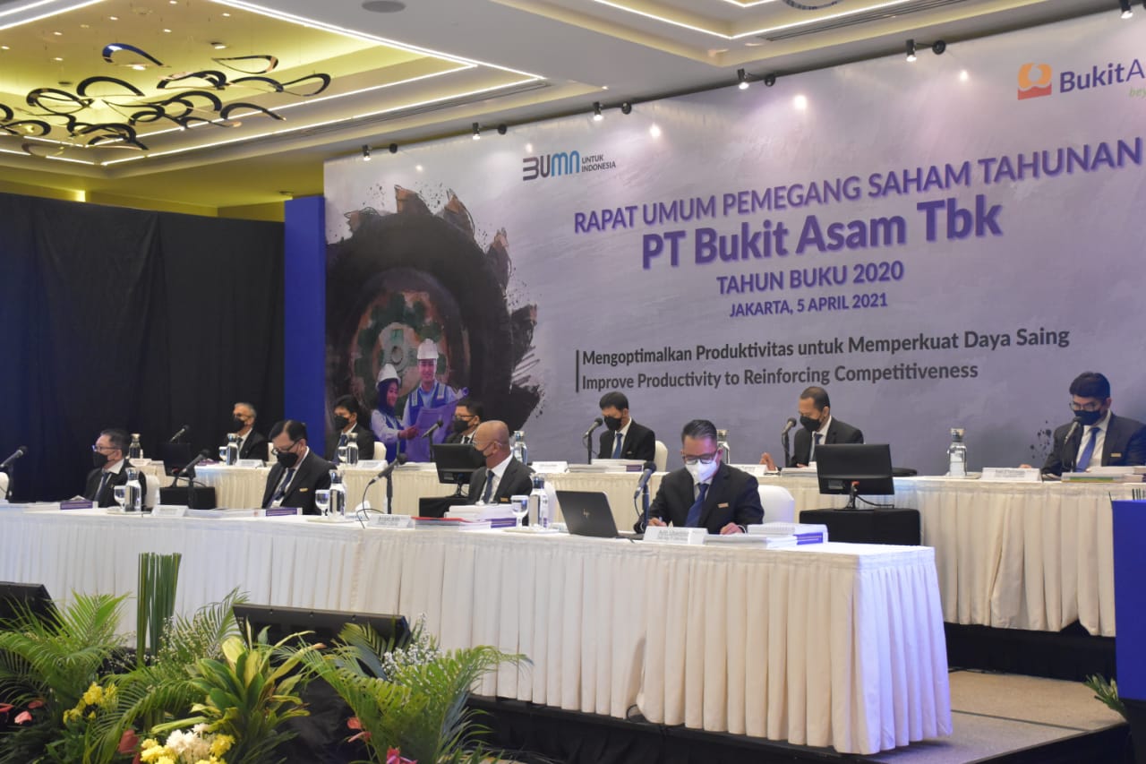Bukit Asam Tbk (PTBA) menggelar Rapat Umum Pemegang Saham Tahunan (RUPST) untuk Tahun Buku 2020 di Hotel Pullman, Jakarta, Senin (05/04/2021).
