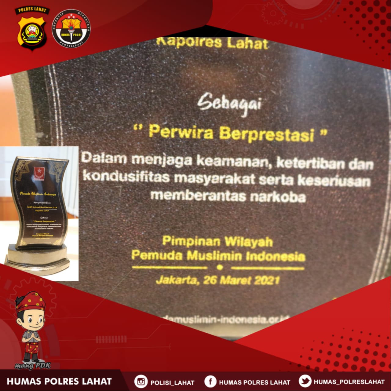 Penganugrahan ini merupakan simbol apresiasi dan dukungan oleh Pemuda Muslimin terhadap Kapolres Lahat AKBP Achmad Gusti Hartono, S.I.K dalam bertugas di wilayah Resort Lahat.