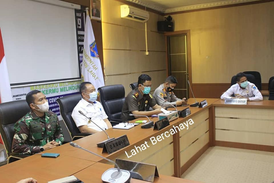 Hadir melalui video conference Bupati Lahat Cik Ujang, SH, Dandim 0405/ Lahat Letkol Kav Shawaf Al Amien, SE, M.Si, Kapolres Lahat AKBP Achmad Gusti Hartono, SIK, Kepala Kejaksaan Negeri Lahat Fithrah, S.H, Pj Sekretaris Daerah Lahat Drs.H. Deswan Irsyad, Assisten I Rudi Thamrin.