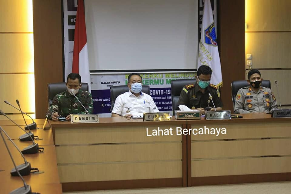 Hadir melalui video conference Bupati Lahat Cik Ujang, SH, Dandim 0405/ Lahat Letkol Kav Shawaf Al Amien, SE, M.Si, Kapolres Lahat AKBP Achmad Gusti Hartono, SIK, Kepala Kejaksaan Negeri Lahat Fithrah, S.H, Pj Sekretaris Daerah Lahat Drs.H. Deswan Irsyad, Assisten I Rudi Thamrin.
