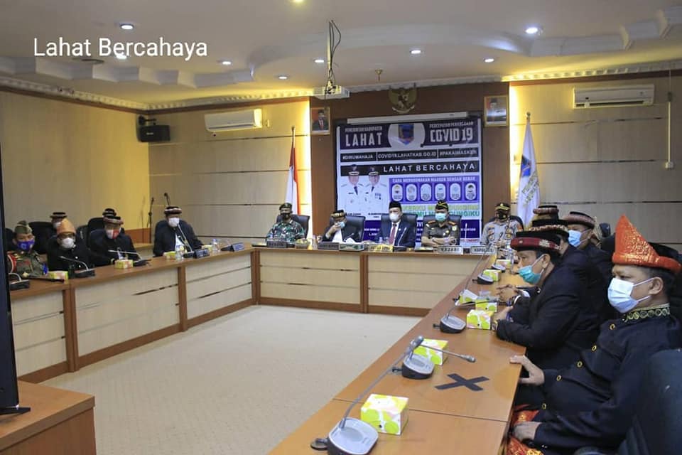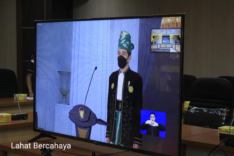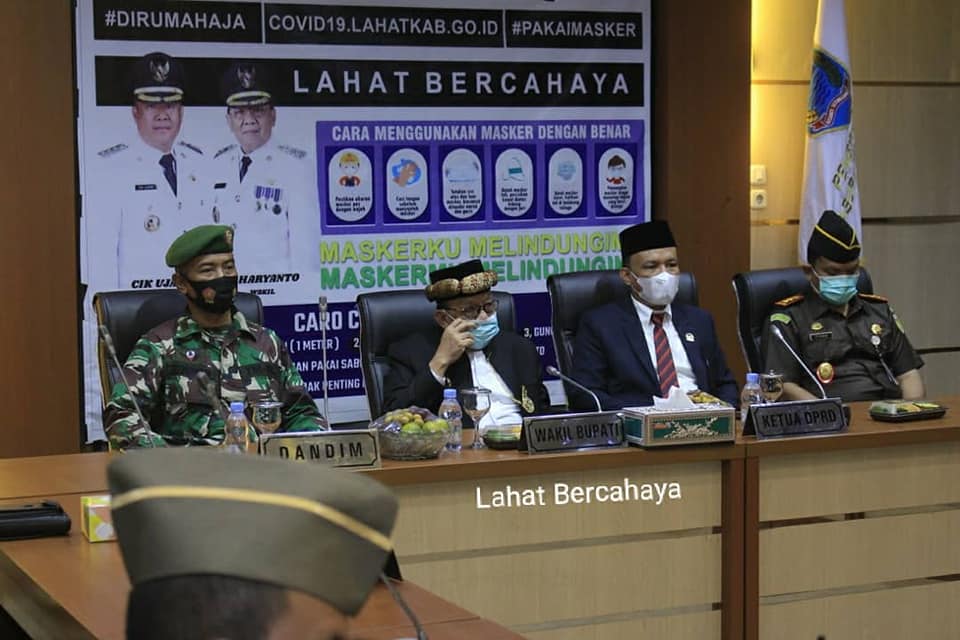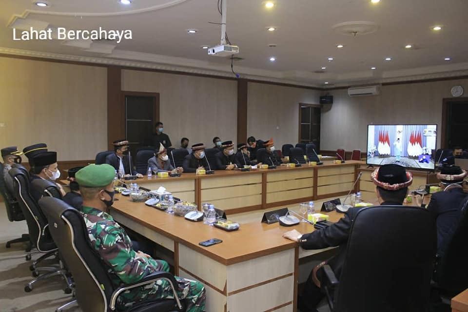 Bupati Lahat,Cik Ujang.SH yang dalam hal ini diwakili oleh Wakil Bupati Lahat H. Haryanto, SE. MM beserta Ketua DPRD Kabupaten Lahat Fitrizal Homizi, ST, Kapolres Lahat AKBP Achmad Gusti Hartono SIK, Kepala Kejaksaan Negeri Lahat Fithrah, SH,MH, Dandim 0405 Lahat diwakili Kapten CZI Gunawan, Assisten I, Kepala OPD dan Kepala Bagian terkait mengikuti Upacara Peringatan Hari Lahir Pancasila, Selasa (1/6/2021) diruang Operation Room Sekretariat Pemerintah Kabupaten Lahat.
