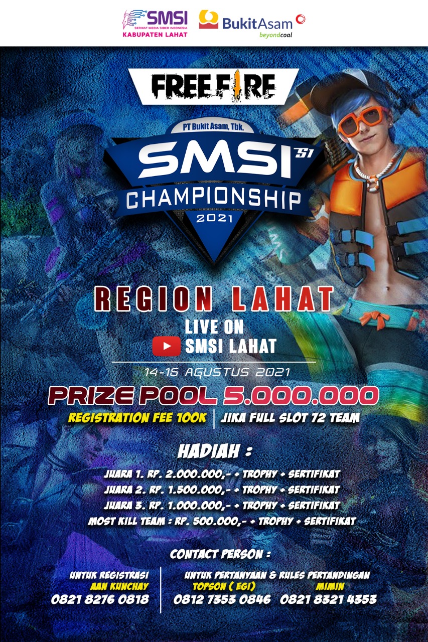 wartabianglala.com – Turut menyemarakkan perayaan Hari Kemerdekaan RI ke-76 tahun 2021 sekaligus mewadahi talenta E-sport di Kabupaten Lahat, Serikat Media Siber Indonesia (SMSI) Kabupaten Lahat menggelar ajang perlombaan game Free Fire (FF) Mode Classic bertajuk SMSI Lahat Free Fire Championship season 1 tahun 2021. Dengan turut menggandeng pihak sponsor seperti PT Bukit Asam, Tbk, perlombaan ini menawarkan hadiah hingga jutaan rupiah bagi para pemenang.