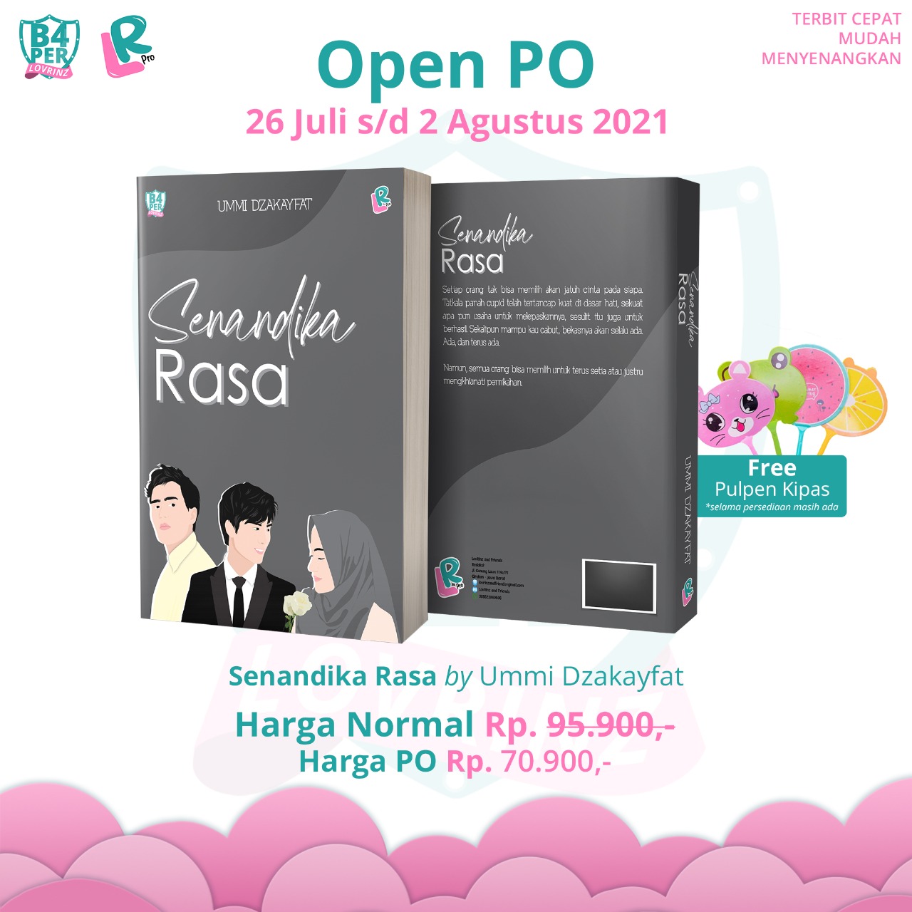 Untuk dapat memiliki novel Senandika Rasa, saat ini masih promo dengan harga PO hanya Rp. 70.900,- dan free ongkir untuk wilayah kota Lahat dan sekitarnya Selain itu ada potongan ongkir 10.000 rupiah untuk wilayah lain (Berlaku hanya selama Open PO 26 Juli sd 2 Agustus 2021). Setelah promo kembali ke harga normal, yakni Rp. 95.900,-.