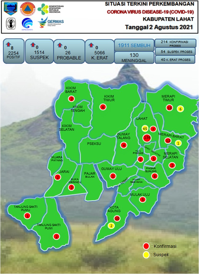 Berdasarkan update dari Gugus Tugas Penanganan Covid-19 di Kabupaten Lahat tanggal 3 Agustus 2021 yang disampaikan Kadin kesehatan Kabupaten Lahat Taufiq Mariansyah Putra, S.Km jumlah pasien terkonfirmasi sebanyak 2277 orang, meninggal 132 orang, sembuh 1971 orang , dalam proses 174 orang.
