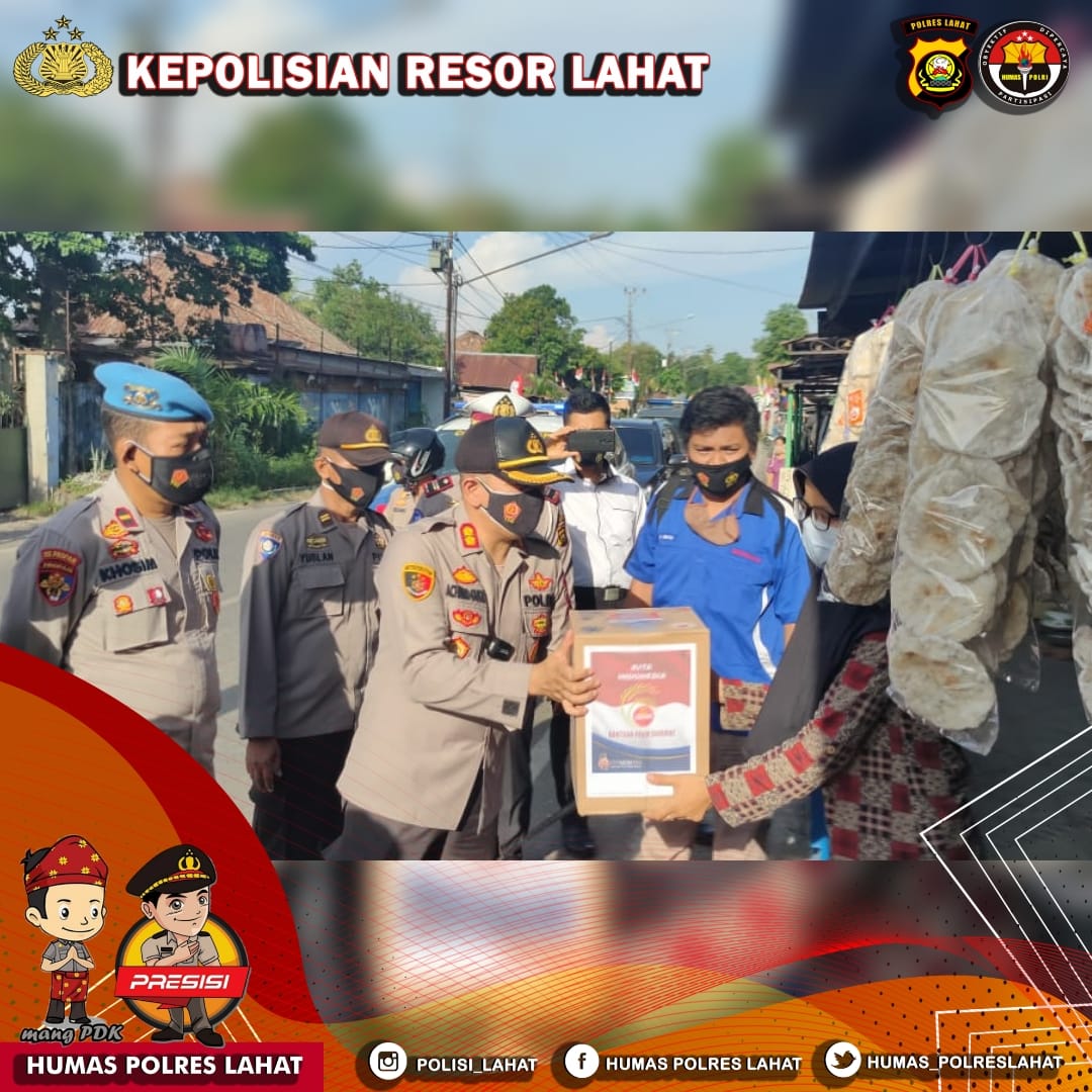 “Kegiatan bansos berupa pembagian sembako yang di tujukan kepada para pedagang kecil, asongan serta penarik gerobak secara langsung di sepanjang jalan RE Martadinata Kelurahan Kelurahan Kota Negara dan jalan lingkar manggul lembayung kelurahan Bandar Agung lahat sebagai wujud polri kepedulian kepada masyarakat akibat adanya PPKM mikro yang di perketat yang mana Kabupaten Lahat saat ini masuk dalam level 3.