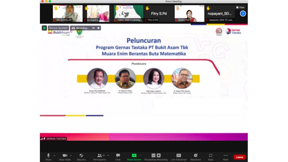 Program ini juga melibatkan dan bersinergi dengan Pemerintah Daerah Kabupaten Muara Enim melalui Dinas Pendidikan dan Kebudayaan. Kegiatan Peluncuran Gernas Tastaka antara PTBA, Pemda Kabupaten Muara Enim, dan NU Circle berlangsung Jumat (13/08/21) secara daring dan dihadiri sekitar 246 peserta, yang sebagian besarnya adalah guru di SD/MI Muara Enim.