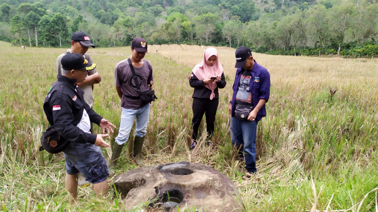 Selanjutnya dari Pondok Iwan kami bergerak ke bawah menuju Ataran Sawah Tinggi dengan menelusuri perkebunan kopi sejauh sekitar 1 km ke arah utara. Setiba di Ataran Sawah Tinggi yang berada di ketinggian 736 mdpl terlihat hamparan sawah dan 2 pondok. Sepeda motor kami parkir tak jauh dari pondok dan kami berjalan sekitar 10 meter terlihat sebuah batu dengan lubang dengan kedalaman sekitar 5 cm yang berisi air. Masyarakat desa menyebutnya sebagai Batu Itik karena selama ini batu berbentuk oval dengan lubang diatasnya ini dimanfaatkan warga sebagai tempat itik makan dan minum. Dari Batu Itik kami terus ke arah sawah sejauh 20 meter, disini ada sebongkah batu yang ditopang beberapa batu dengan lubang berdiameter 15 cm di bagian atasnya. Batu yang berada di sawah milik Angga ini disebut masyarakat sebagai Batu Beghuk atau Beruk. Masyarakat melihat batu ini seperti muka seekor binatang beghuk atau beruk. Setelah kami amati ternyata batu ini merupakan sebuah lumpang batu berlubang 3 seperti yang pernah kami lihat di beberapa situs megalit yang tersebar di Kabupaten Lahat. Pada bagian tepi lubang ada juga bagian pelipit atau pembatas. Kami berkesimpulan bahwa kedua batu yang kami lihat merupakan tinggalan masa megalit. Maka situs megalit Batu Beghuk atau lumpang batu ini merupakan situs megalit ke-62 yang ada di Kabupaten Lahat dan makin mengukuhkan Kabupaten Lahat sebagai Negeri 1.000 Megalit.
