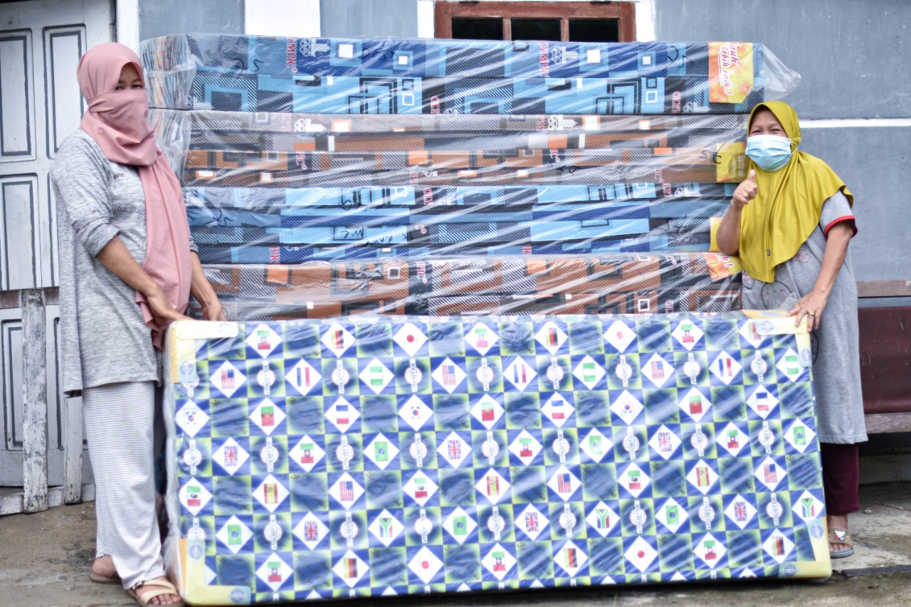 Vivit, 42 tahun warga bedeng kaca salah satu penerima bantuan kasur mengucapkan syukur Alhamdulillah adanya bantuan kasur dari PTBA sehingga dapat mengganti kasur yang basah.