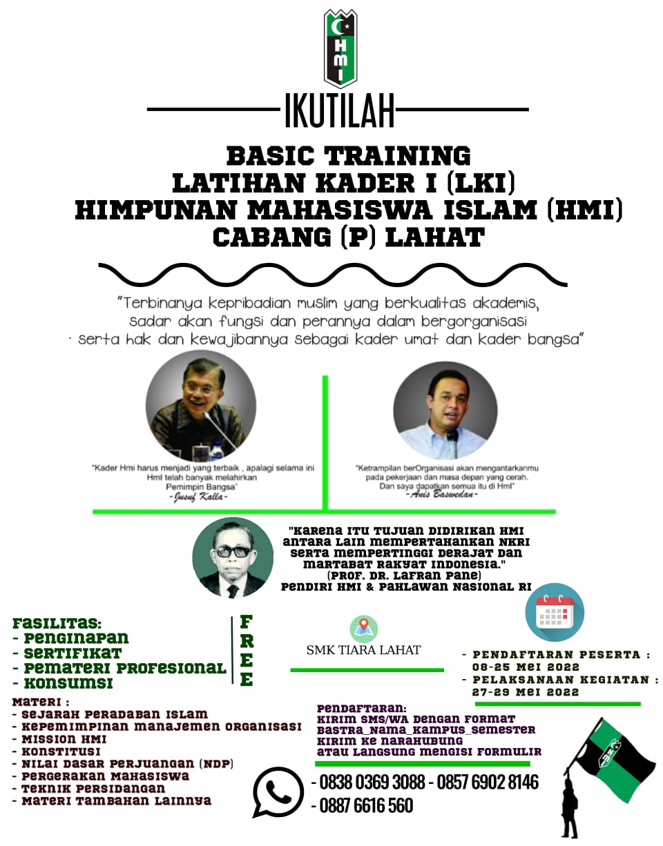 Lahat – Dalam upaya untuk memperkokoh dan menyebarluaskan nilai-nilai keislaman, dan menyebarluaskan Panji Hijau Hitam, Himpunan Mahasiswa Islam (HMI) Cabang Persiapan Lahat menggelar Basic Training atau Latihan Kader I (LK I) yang berlangsung di SMK Tiara Lahat, (25/05/2022).