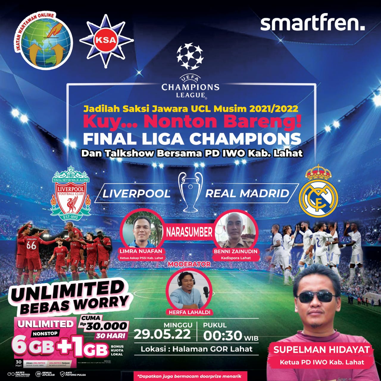 Guna mengobati rasa rindu bagi penggemar si kulit bundar, PD Ikatan Wartawan Online (IWO) Lahat menggelar Nonton Bareng Final Liga Champions antara Real Madrid VS Liverpool pada Minggu dini hari 29 Mei 2022 pukul 24 : 00 wib.