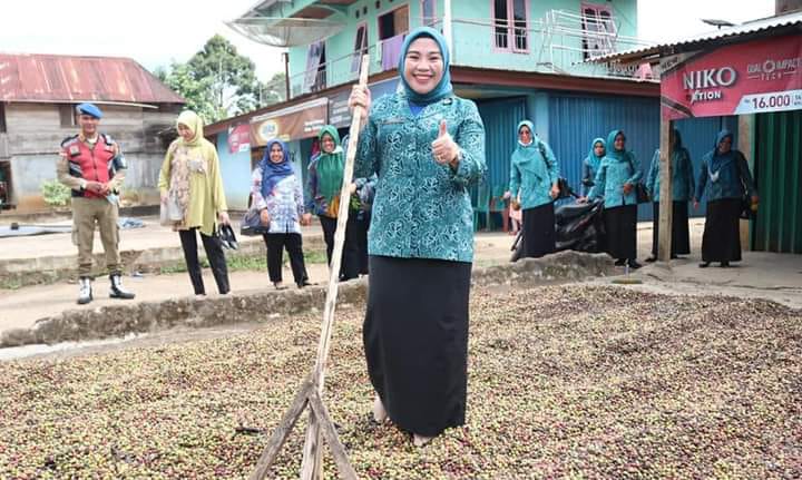 wartabianglala.com, Lahat – Lidyawati Cik Ujang SHut, sebagai Ketua TP PKK Lahat, melakukan kunjungan ke petani kopi di Desa Rindu Hati, Kecamatan Gumay Ulu, pada Kamis (2/6/2022) yang saat ini sedang melakukan pasca panen dan melakukan penjemuran kopi.