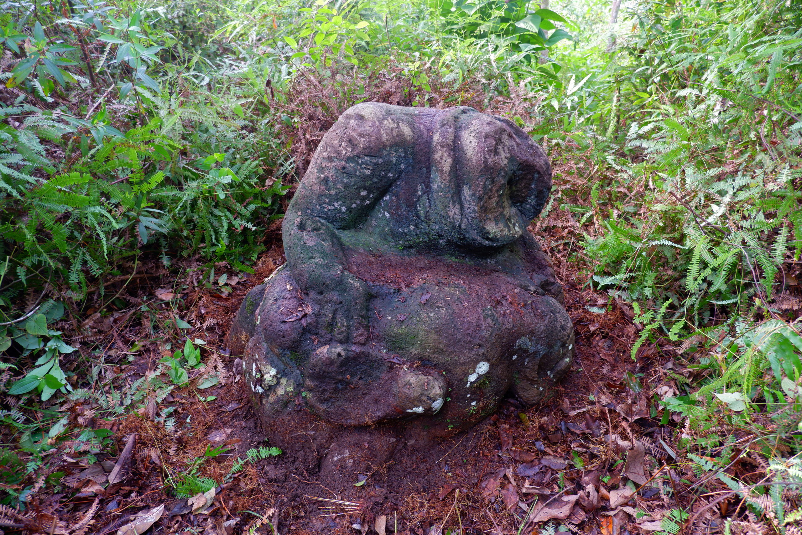 Akhirnya menemukan 2 Lesung batu di pangkal kebun karet. Dilanjutkan pencarian ke dalam kebun yang juga ditumbuhi pohon kopi ditemukan satu arca tanpa kepala yang dihiasi kalung di lehernya. Satu arca yang rebah, dan satu batu datar yang digores (ada relief) yang berbentuk dua kaki manusia dan sisi lainnya berupa kepala dan ornament lain tapi kini tertutup. Panjang batu datar sekitar 1,4 meter persegi dan tinggi sekitar 1,2 meter (dari buku Van Der Hoop).