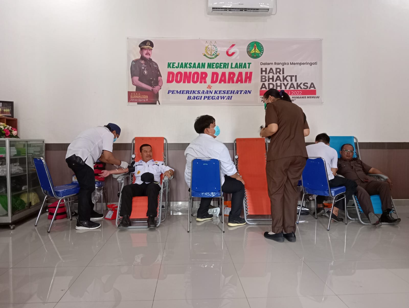 Kegiatan donor darah dan pemeriksaan kesehatan gratis bagi seluruh keluarga besar Kejaksaan Negeri Lahat, ASN di lingkungan Pemkab Lahat dan masyarakat Lahat, berlangsung di ruang Adyaksa Dharmakarini Kejaksaan Negeri Lahat. Dimulai langsung oleh Kajari Lahat Nilawati SH MM serta beberapa pejabat di lingkungan Pemerintah Daerah Kabupaten Lahat antusias mengikuti kegiatan ini.