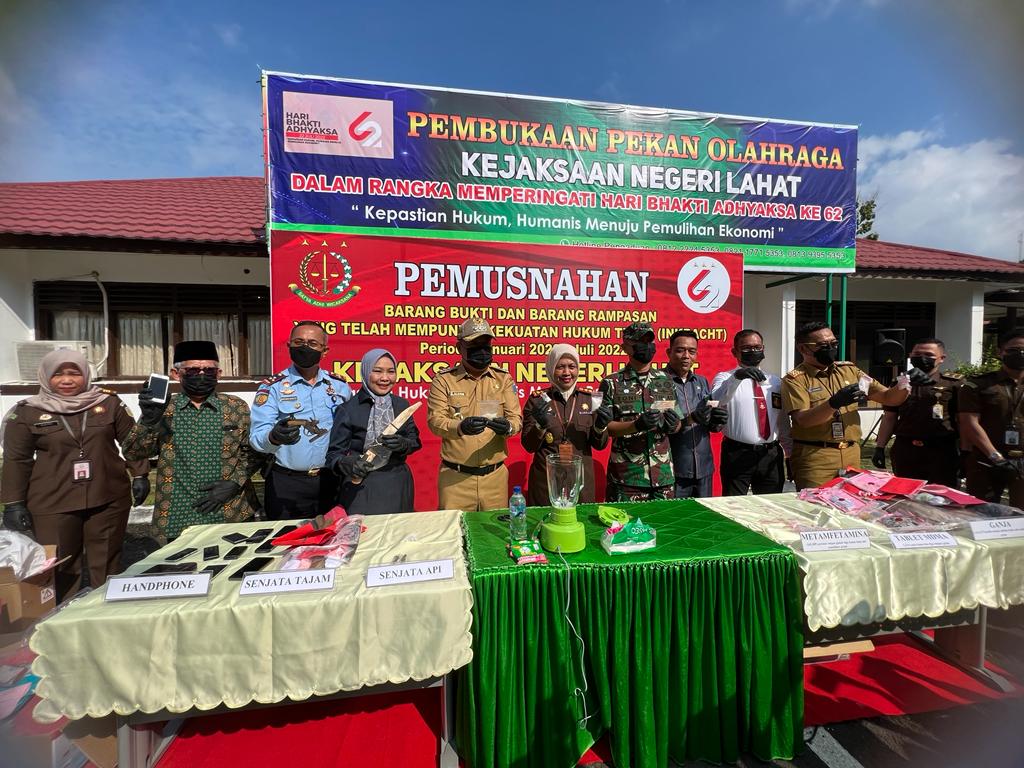 Kejari Lahat Nilawati, S.H., M.M. dalam laporannya menyampaikan; Pemusnahan barat bukti dan barang rampasan terhitung periode Januari 2022 hingga Juli 2022 dengan masing-masing; Metamfetamin 143, 509 Gram, Tablet MDMA 1,234 gram, Ganja 1.11,173 gram serta barang bukti lain seperti alat hisap sabu baju, celana, tas handphone, timbangan serta lain – lainnya. Selain itu juga disebutkan, untuk tindak pidana terhadap orang dan harta benda meliputi 50 perkara barang di antaranya satu senjata api rakitan, 3 (Roki) butir peluru, senjata tajam 7 bilah serta alat bukti lainnya.