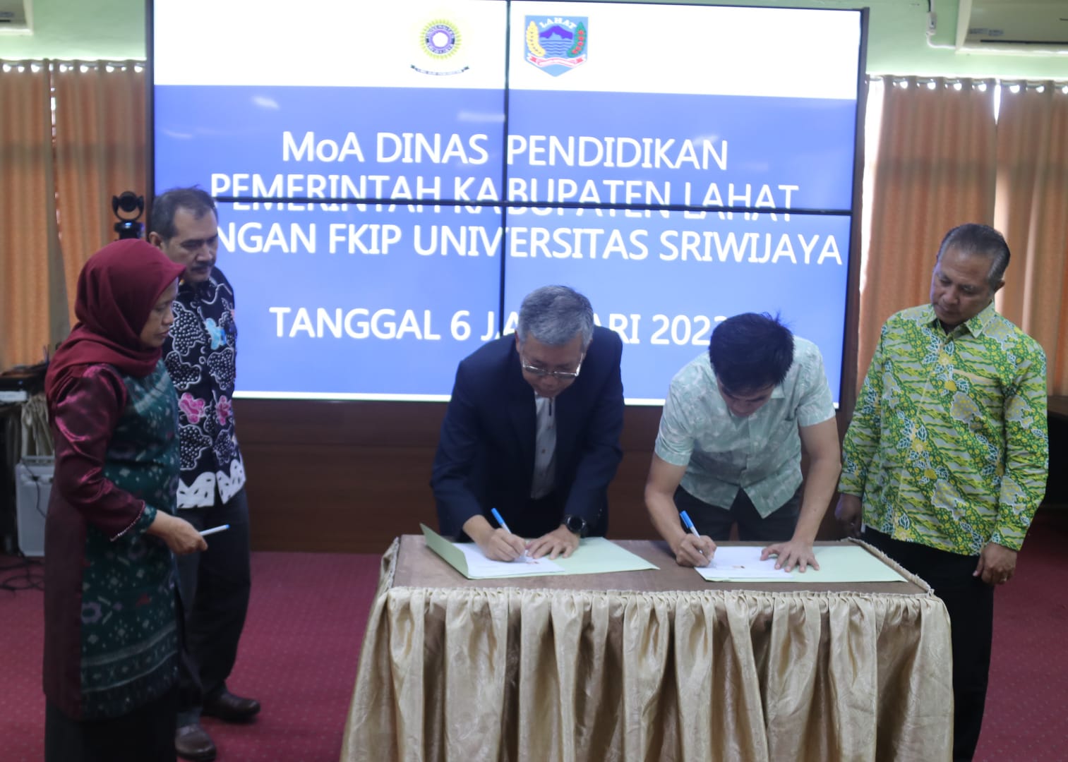 Penandatanganan MoA ini dilakukan oleh DR Hasperi Susanto,S.Pd.,MM selaku Dinas Pendidikandan dan Kebudayaan Kabupaten Lahat sedangka dari PPs Unsri ialah DR Hartono,MA selaku Dekan FKIP Unsri.