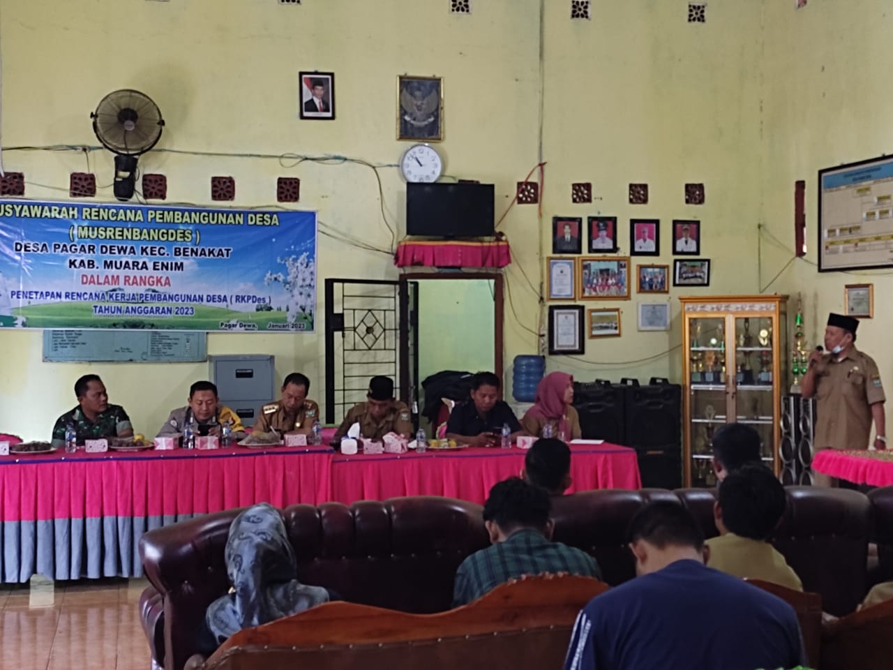 Muara Enim – Pemerintah Desa (Pemdes) Pagar Dewa Kecamatan Benakat kabupaten Muara Enim laksanakan Musyawarah Rencana Pembangunan (Musrenbang) Desa Tahun Anggaran 2023 untuk usulan program kegiatan Tahun 2024, acara dilaksanakan di Kantor Desa Pagar Dewa Kecamatan Benakat Kabupaten Muara Enim.