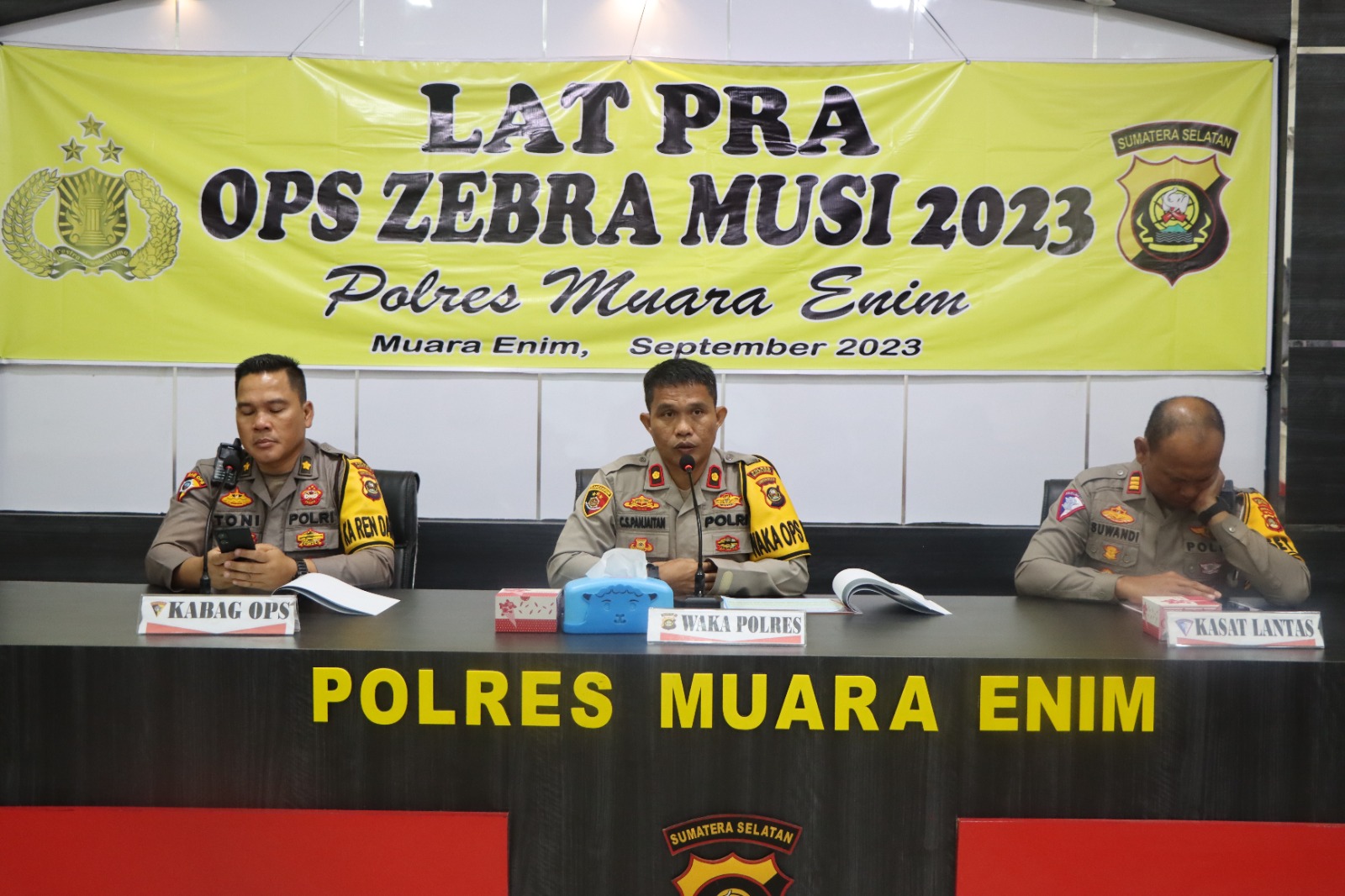 Sebagai bagian dari persiapan untuk Operasi Zebra Musi 2023, Polres Muara Enim menggelar Latihan Pra Operasi (Lat Pra Ops) di Ruangan Rupatama Polres Muara Enim pada tanggal 4 September 2023. Latihan ini memiliki tema “melalui Lat Pra Ops Zebra Musi 2023 kita wujudkan tertib berlalu lintas guna mewujudkan kamseltibcar lantas yang kondusif menuju pemilu damai 2024.”