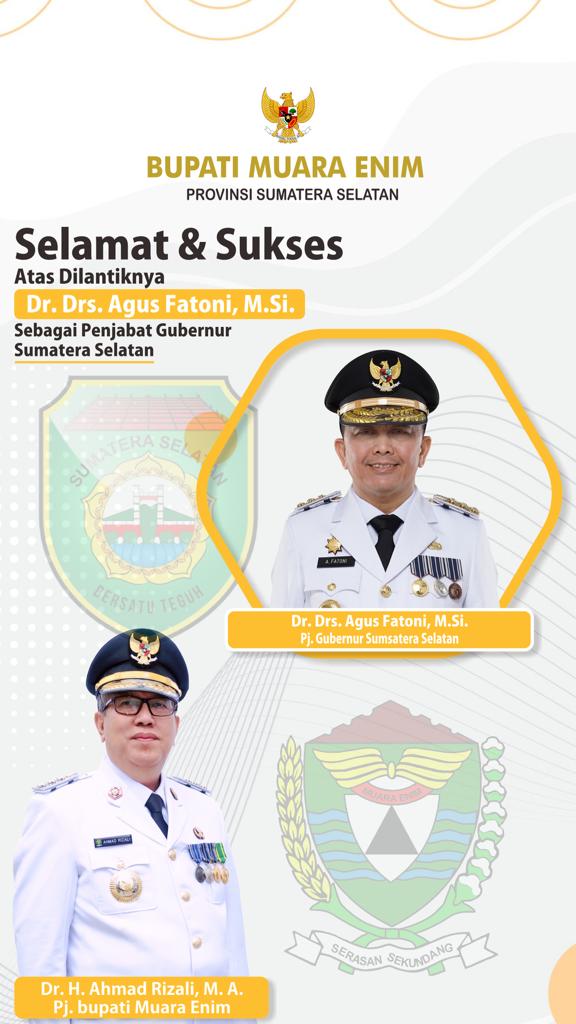 Muara Enim – PJ Bupati Muara Enim Dr H Ahmad Rizali MA sampaikan ucapan Selamat dan Sukses atas dilantik nya Dr Drs Agus Fatoni M Si sebagai PJ Gubernur Sumsel yang dilantik langsung oleh Menteri Dalam Negeri (Mendagri) Tito Karnavian, diketahui pelantikan dilaksanakan di Sasana Bhakti Praja, Gedung C Kementerian Dalam Negeri, Jakarta Pusat, Senin (2/10/2023).