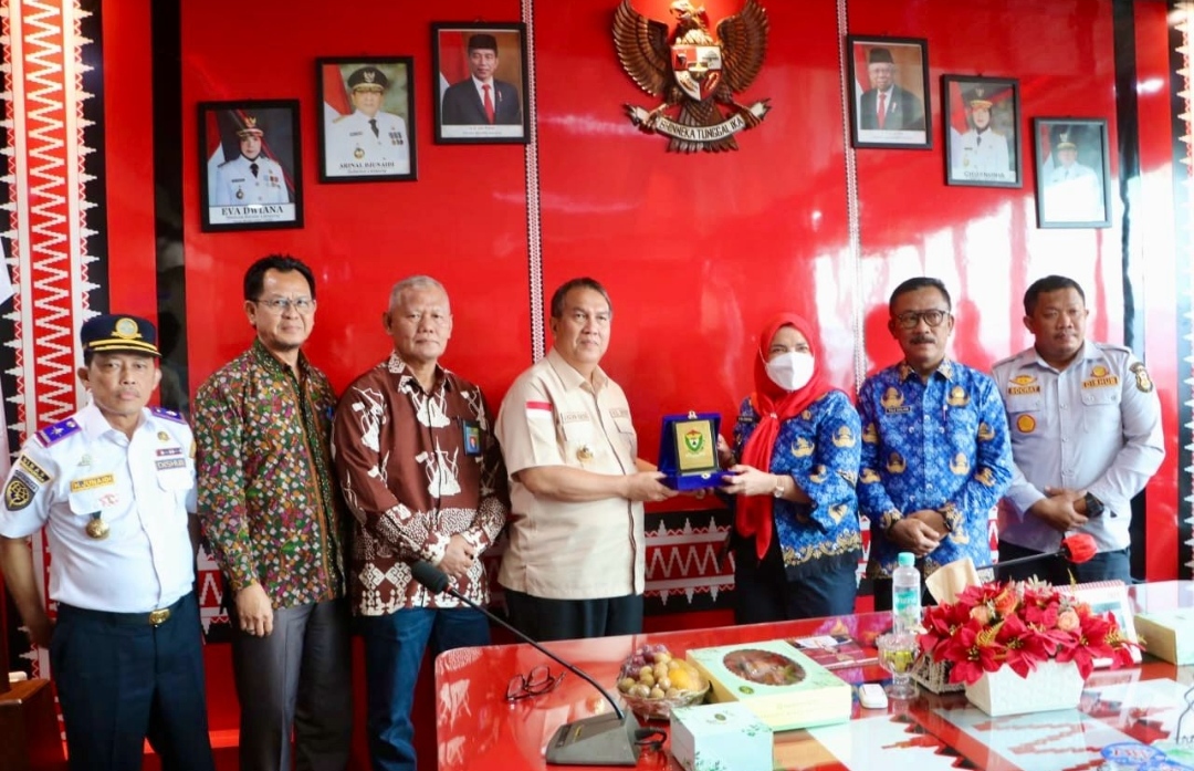 Lampung – Pj. Bupati Muara Enim, Dr. H. Ahmad Rizali, M.A. dan Walikota Bandar Lampung, Hj. Eva Dwiana, S.E. berdiskusi terkait program unggulan dan strategis di daerah masing-masing disela kunjungan kerjanya ke Kantor Pemerintah Kota Bandar Lampung, Selasa (17/10).