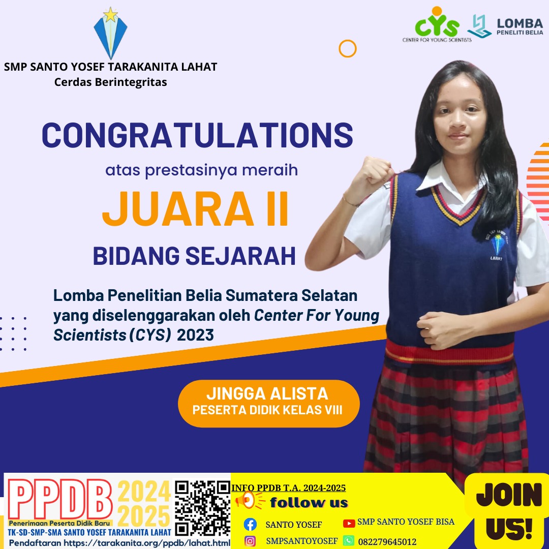 Wartabianglala.com – Lahat, Keunggulan Siswi Kelas VIII A SMP Santo Yosef, Jingga Alista sulung dari dua bersaudara ini meraih Juara II lomba Peneliti Belia Sumsel 2023 yang diselenggarakan oleh Center For Young Scientist (CYS) membanggakan masyarakat Lahat.