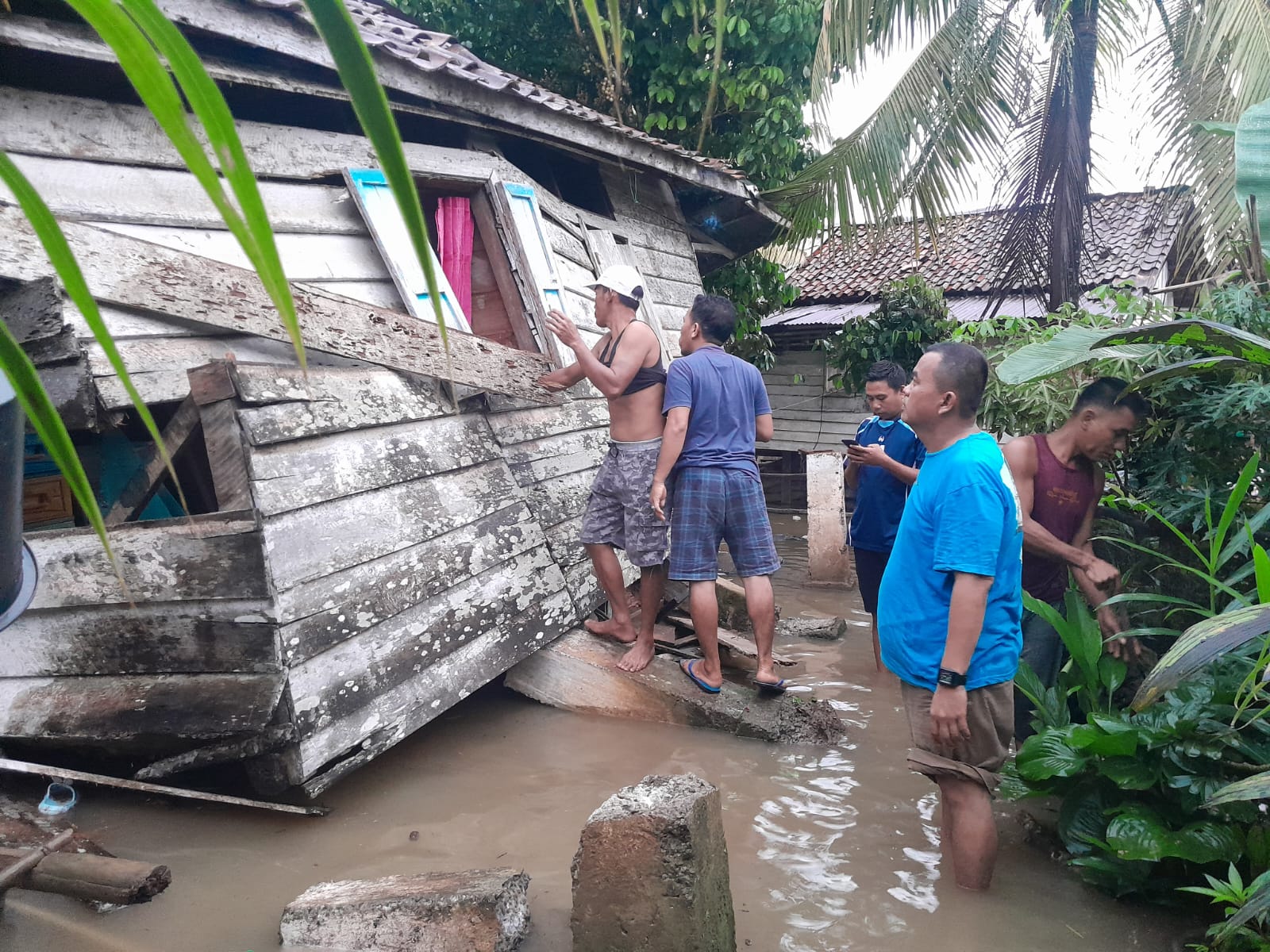 Terlihat, Kades dan warga nya dengan kompak membantu warga yang rumah nya roboh akibat derasnya aliran air. Sabtu (13/1).