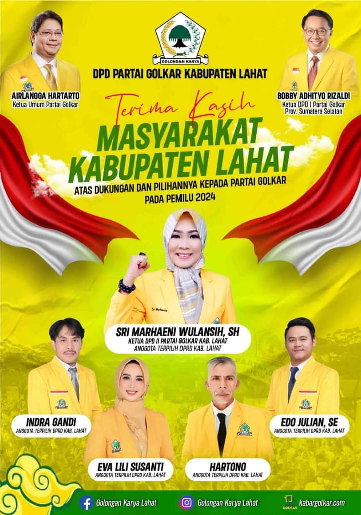 wartabianglala.com, Lahat – DPD II Golkar Lahat masih melanjutkan trend positif sebagai partai papan atas di Kabupaten Lahat. Pada pileg 2024 Kabupaten Lahat, partai berlambang pohon beringin dibawah kepemimpinan Sri Marhaeni Wulansih, S.H berhasil meraup 5 kursi.