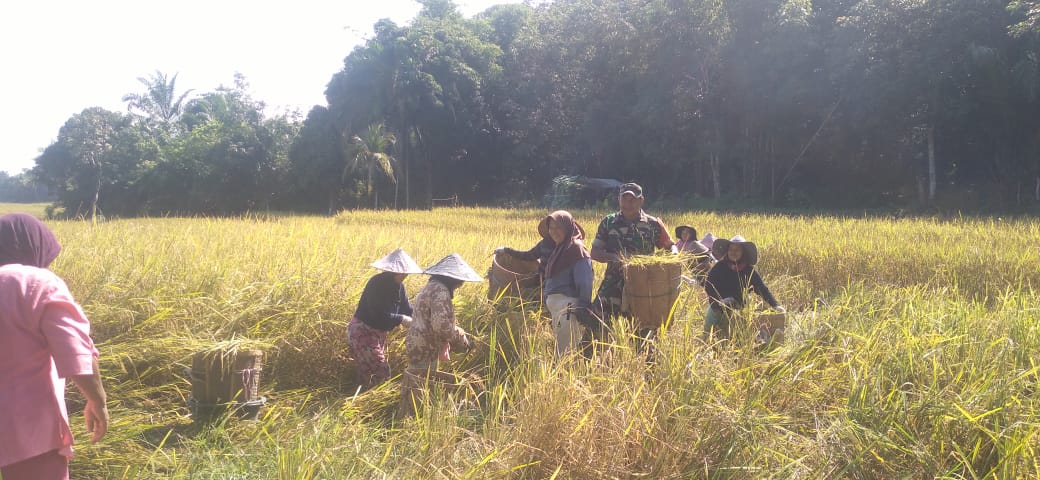Muara Enim – Sertu Jarkoni, Babinsa Koramil 404-05 /Tanjung Enim, Kodim 0404/Muara Enim,  terjun langsung bantu petani Panen Padi di Sawah Desa Muara Meo Kecamatan Panang Enim Kabupaten Muara Enim.