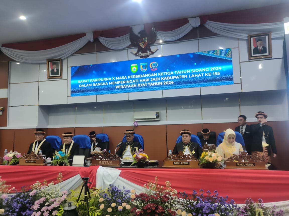 wartabianglala.com, Lahat – Dalam rangka memperingati Hari Jadi Kabupaten Lahat ke-155 Perayaan XXVI Tahun 2024, DPRD Kabupaten Lahat menggelar Rapat Paripurna X Masa Persidangan Ketiga Tahun 2024. Senin (20/05/2024).