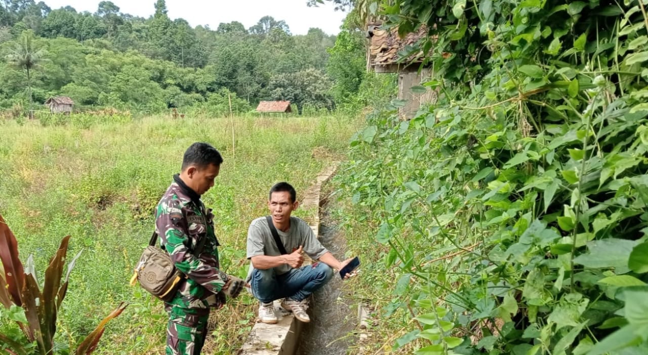 Muara Enim – Serda Dedi Kurniawan Babinsa melaksanakan pengecekan saluran irigasi persawahan di Desa Pulau Panggung Kecamatan Tanjung Agung Kabupaten Muara Enim