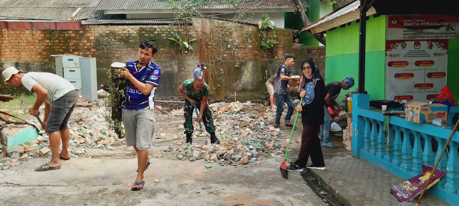 Muara Enim – Serda Nyamadi Babinsa Koramil 404-05/Tanjung Enim Bersama karang taruna, Lurah dan ketua RW, melaksanakan gotong royong membersihkan sisa bangunan yang sudah tidak layak lagi yang berada di seputaran kantor Lurah Tanjung Enim Selatan (TES) Kecamatan Lawang Kidul Kabupaten Muara Enim.
