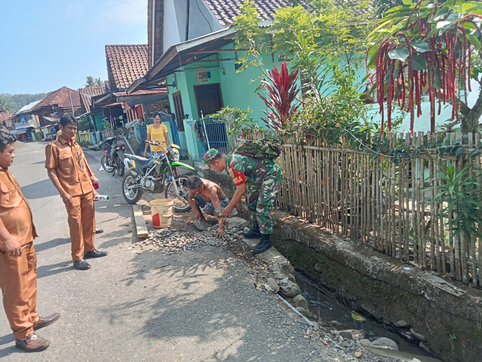 Muara Enim – Babinsa Koramil 404-05/Tanjung Enim, Serka Pasli Karyadi turut serta membantu warganya melaksanakan gotong royong dalam pembuatan Siring di depan Rumah Warga binaannya yang bertempat di Dusun Dua Desa Pagar Dewa Kecamatan Tanjung Agung, Kabupaten Muara Enim.