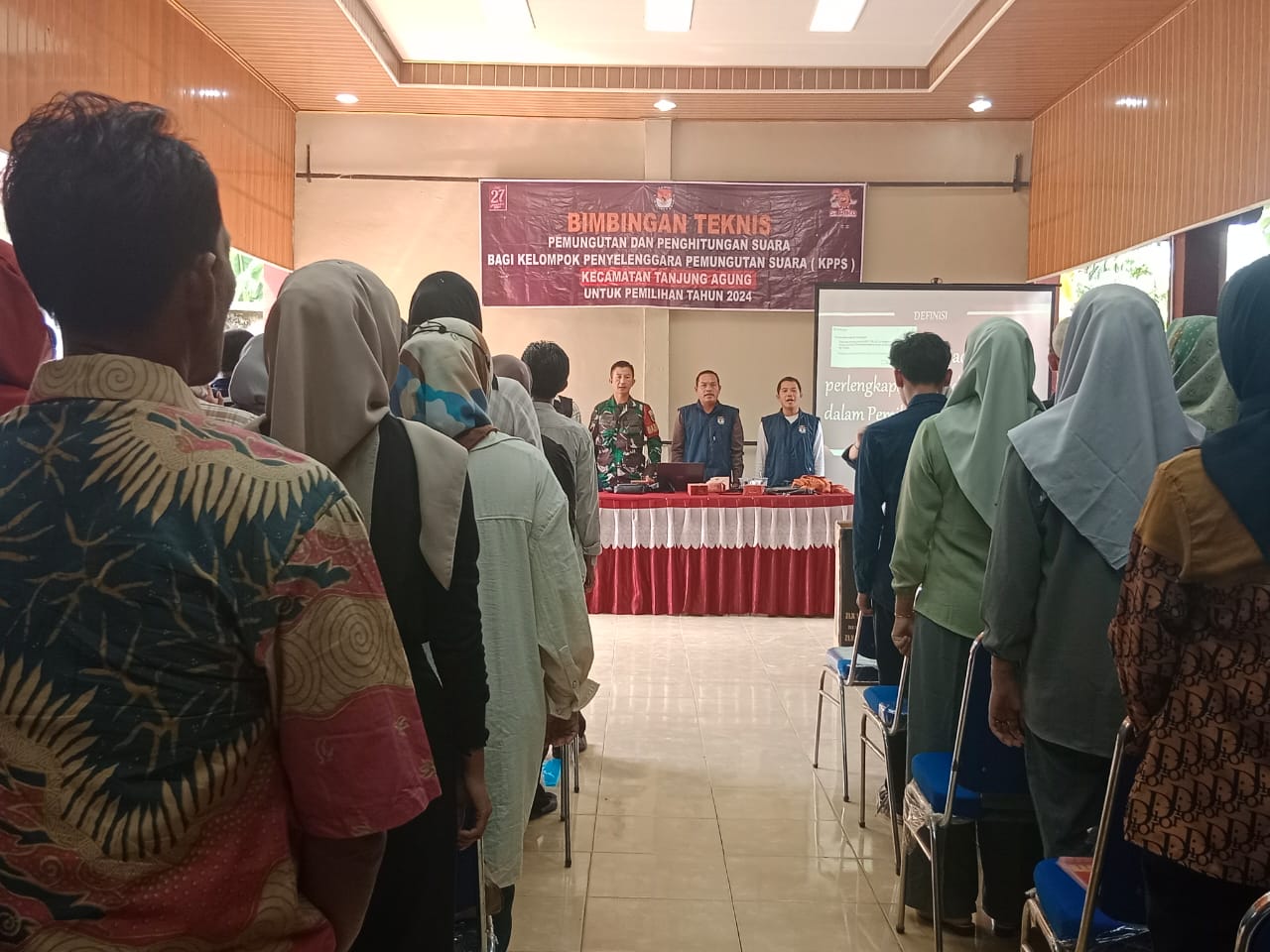 Muara Enim – Sertu Marhadi K Supran lakukan hadiri acara Bimbingan Teknik (Bimtek) dilanjutkan Simulasi Pemungutan dan Perhitungan Suara Bagi Kelompok Penyelenggara Pemungutan Suara (KPPS) Kecamatan Tanjung Agung Kabupaten Muara Enim untuk Pemilihan Tahun 2024,