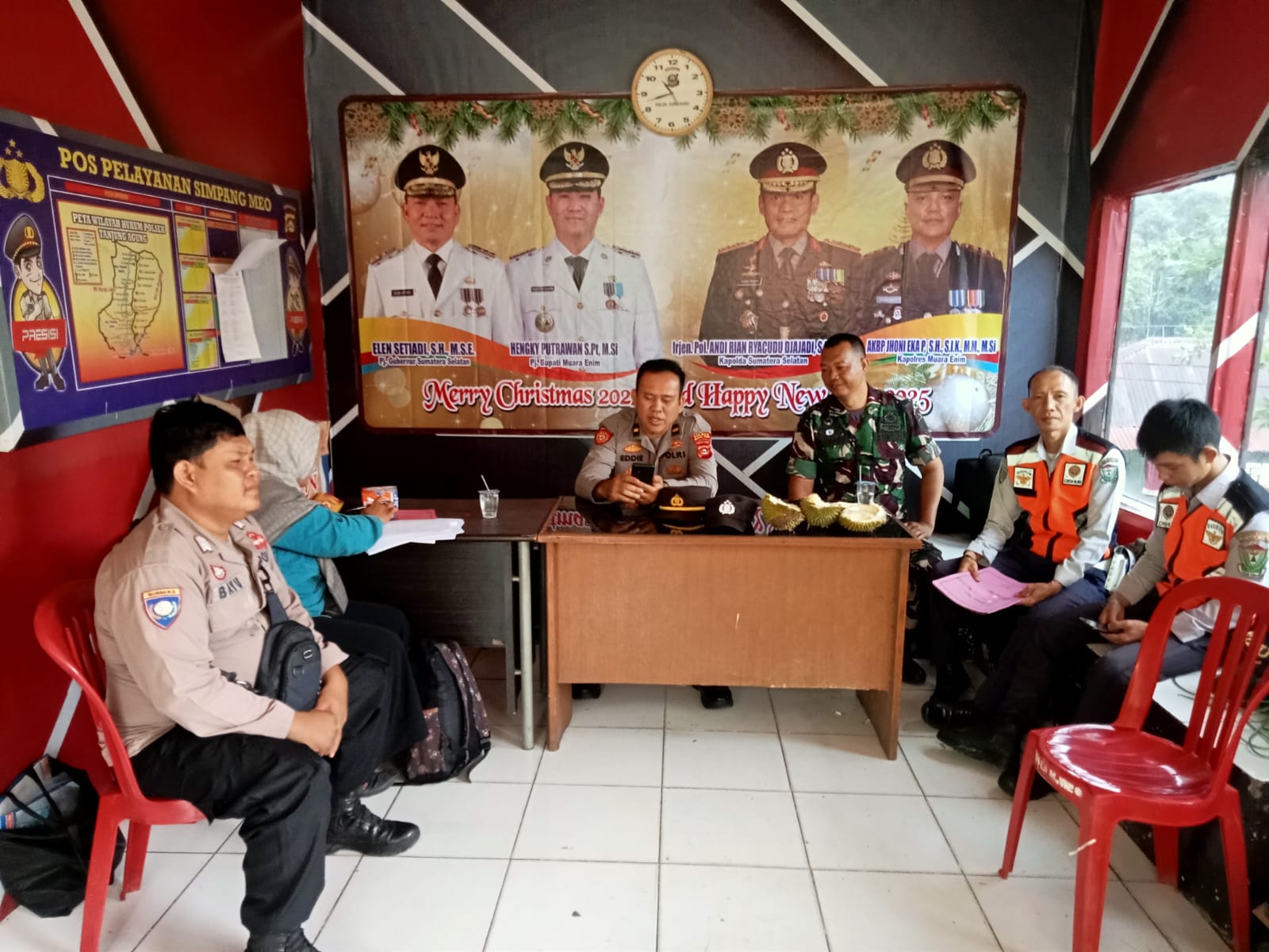 Muara Enim – Sertu Bambang Irawan Babinsa Koramil 404-05/Tanjung Enim laporkan situasi terkini di Pos PAM dalam rangka Natal dan Tahun Baru (Nataru) tahun 2025, dimana tetap aman dan kondusif, tepat nya di Simpang Meo Desa Muara Meo Kecamatan Panang Enim Kabupaten Muara Enim