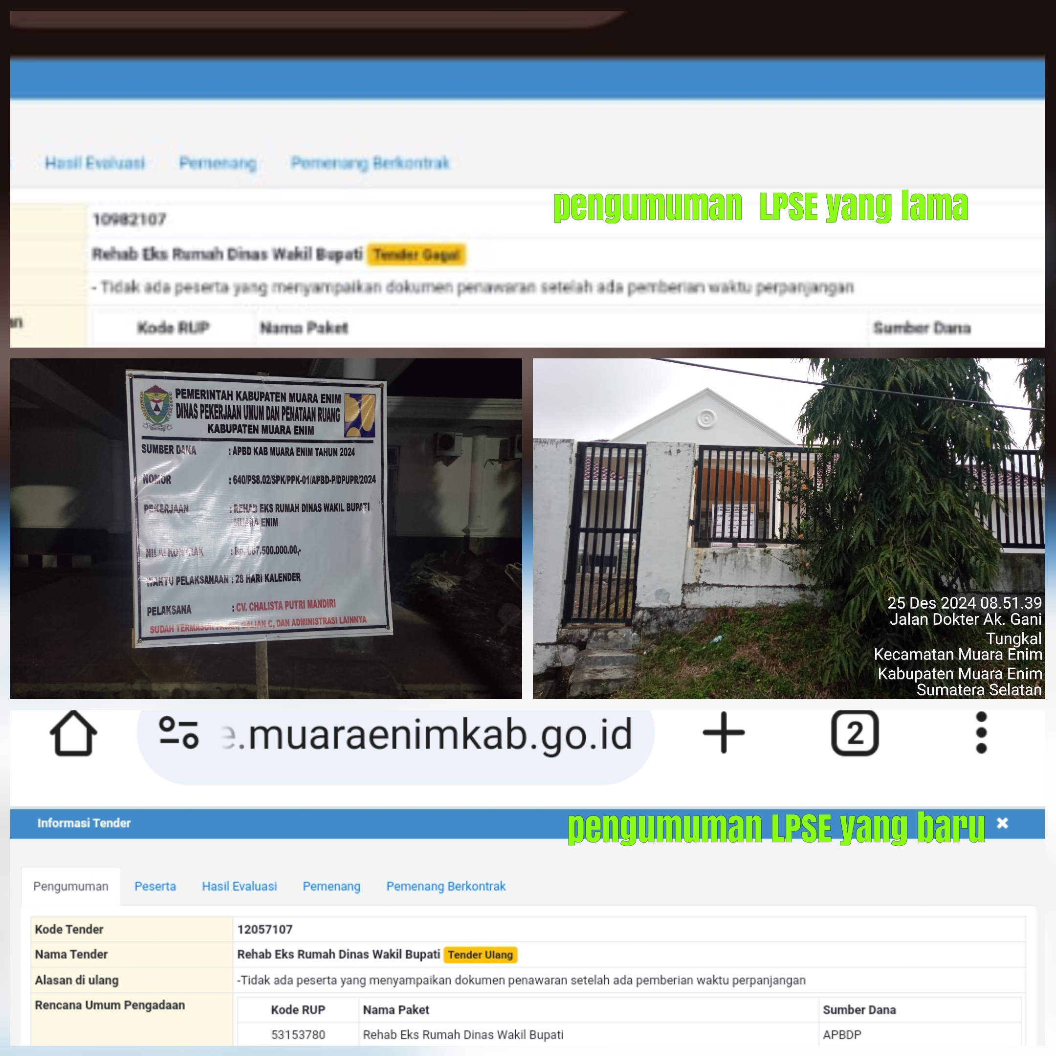 Diketahui, alasan dari pembatalan tender Rehap Eks Ruma Wabup Muara Enim berdasarkan isi dari pengumuman yang kami dapatkan dari salah satu kontrol sosial yang meminta nama nya dirahasiakan, sebagai berikut. Jumat (27/12).