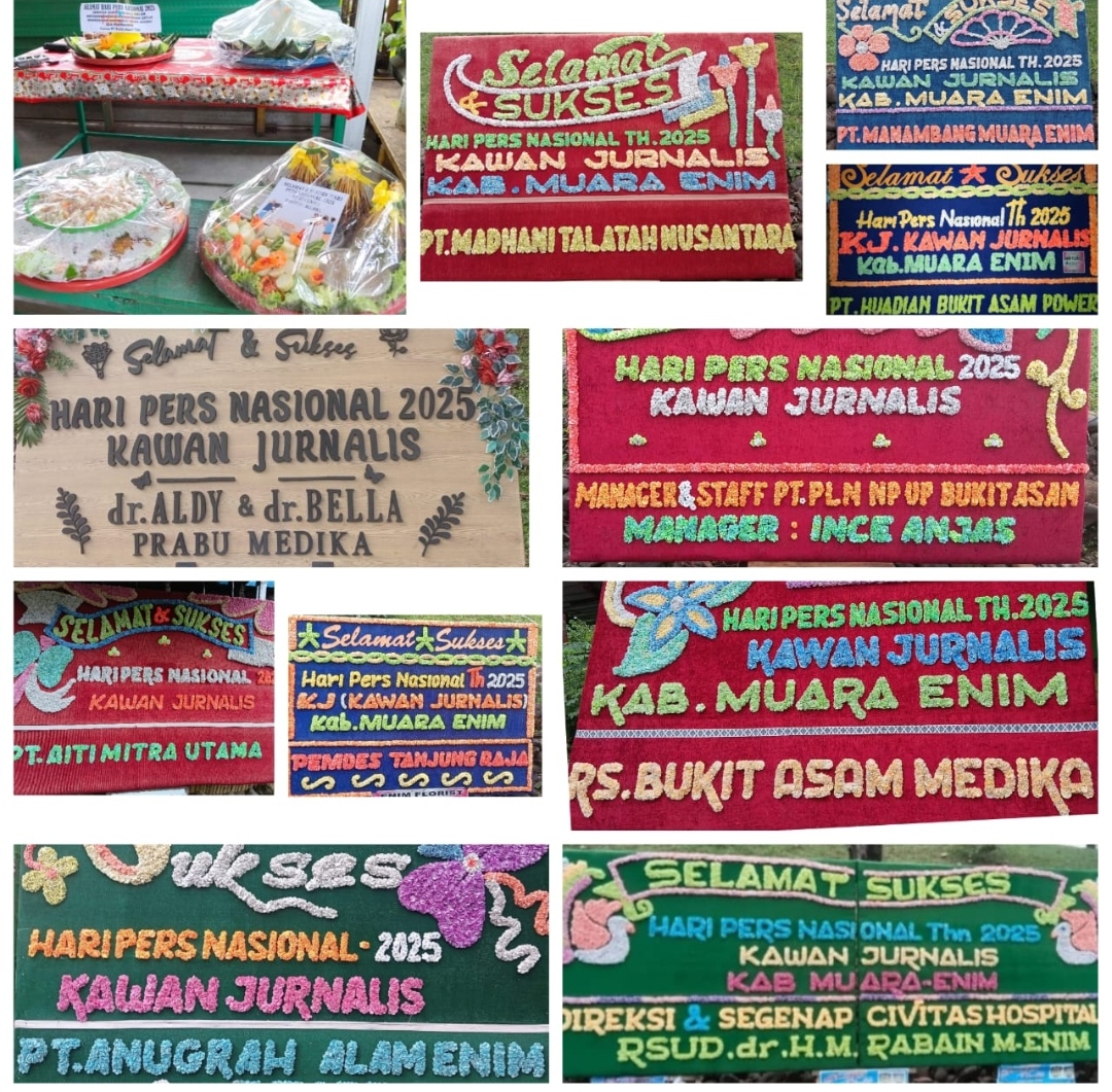 Ucapan “Selamat dan Sukses” Mewarnai Setiap Rangkaian Bunga yang diberikan para Mitra Pers Kawan Jurnalis, baik dari perusahaan maupun dari Instansi Pemerintahan yang ada di kabupaten Muara Enim.Tidak hanya Rangkaian bunga, beberapa Mitra pers Kawan jurnalis juga Memberikan Tumpeng.