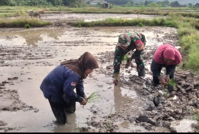 Muara Enim – Serma Agus Fery Irawan Babinsa Koramil 404-05/Tanjung Enim bersama Petani melaksanakan pendampingan penanaman Padi sawah di Desa Matas Kecamatan Tanjung Agung Kabupaten Muara Enim.