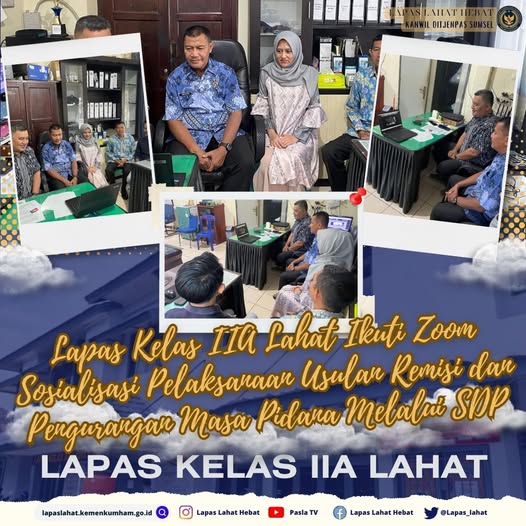 Lahat, 18 Juli 2025 — Lembaga Pemasyarakatan (Lapas) Kelas IIA Lahat turut serta dalam kegiatan Zoom Meeting Sosialisasi Pelaksanaan Usulan Remisi Umum, Remisi Tambahan, dan Remisi Dasawarsa bagi Narapidana, serta Pengurangan Masa Pidana Umum dan Dasawarsa bagi Anak Binaan yang diselenggarakan oleh Direktorat Jenderal Pemasyarakatan melalui Sistem Database Pemasyarakatan (SDP).