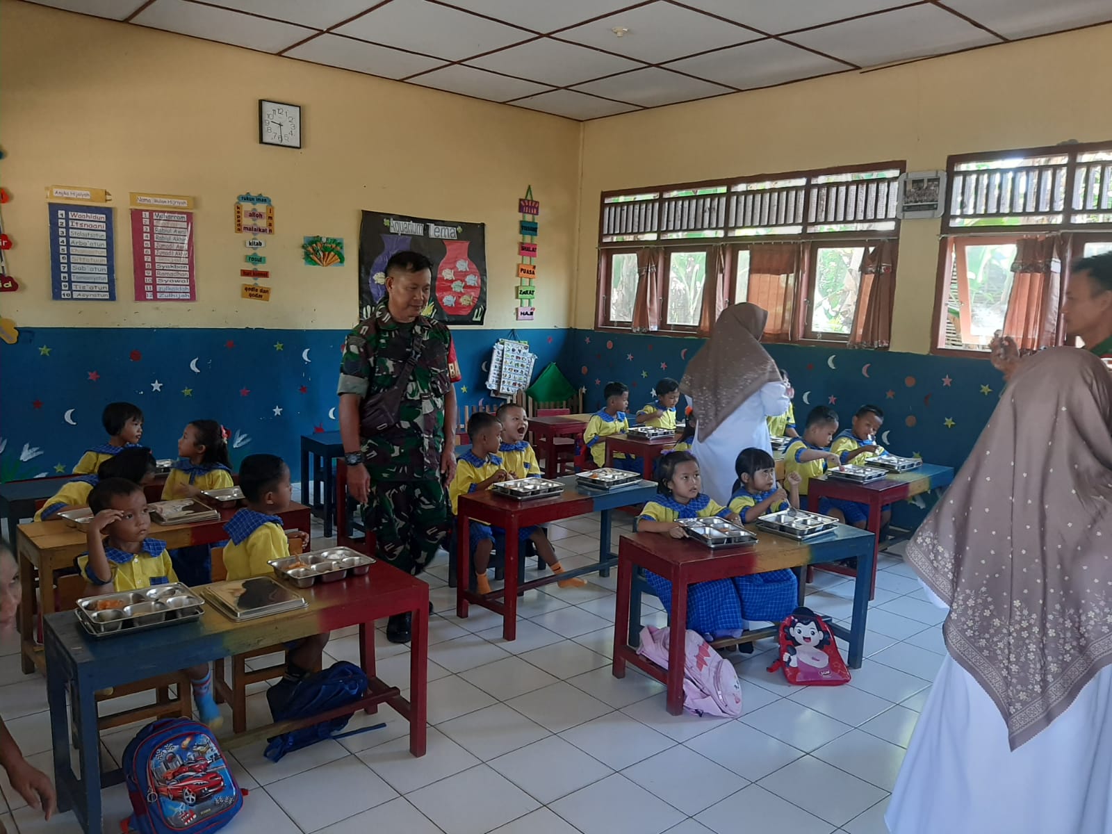 Muara Enim – Babinsa Koramil 404-05/Tanjung Enim Serma Khoiril Sakban mendampingi pendistribusian Makan Bergizi Gratis (MBG) di sekolah-sekolah di wilayah Kecamatan Tanjung Agung Kabupaten Muara Enim.