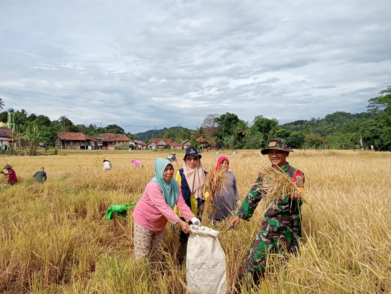 Babinsa Pandan Dulang Panen Padi Bersama PPL dan Masyarakat Desa Binaan