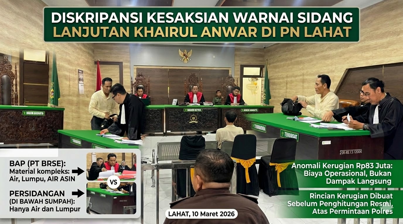 LAHAT – Gelanggang peradilan di Pengadilan Negeri (PN) Lahat kembali bergulir pada Selasa (10/03), dalam perkara yang menyeret nama Khairul Anwar. Sidang dengan agenda mendengarkan keterangan saksi yang dihadirkan oleh Jaksa Penuntut Umum (JPU) ini menjadi sorotan tajam setelah munculnya sejumlah ambiguitas dan ketidakkonsistenan substansial antara keterangan saksi di muka persidangan dengan Berita Acara Pemeriksaan (BAP).