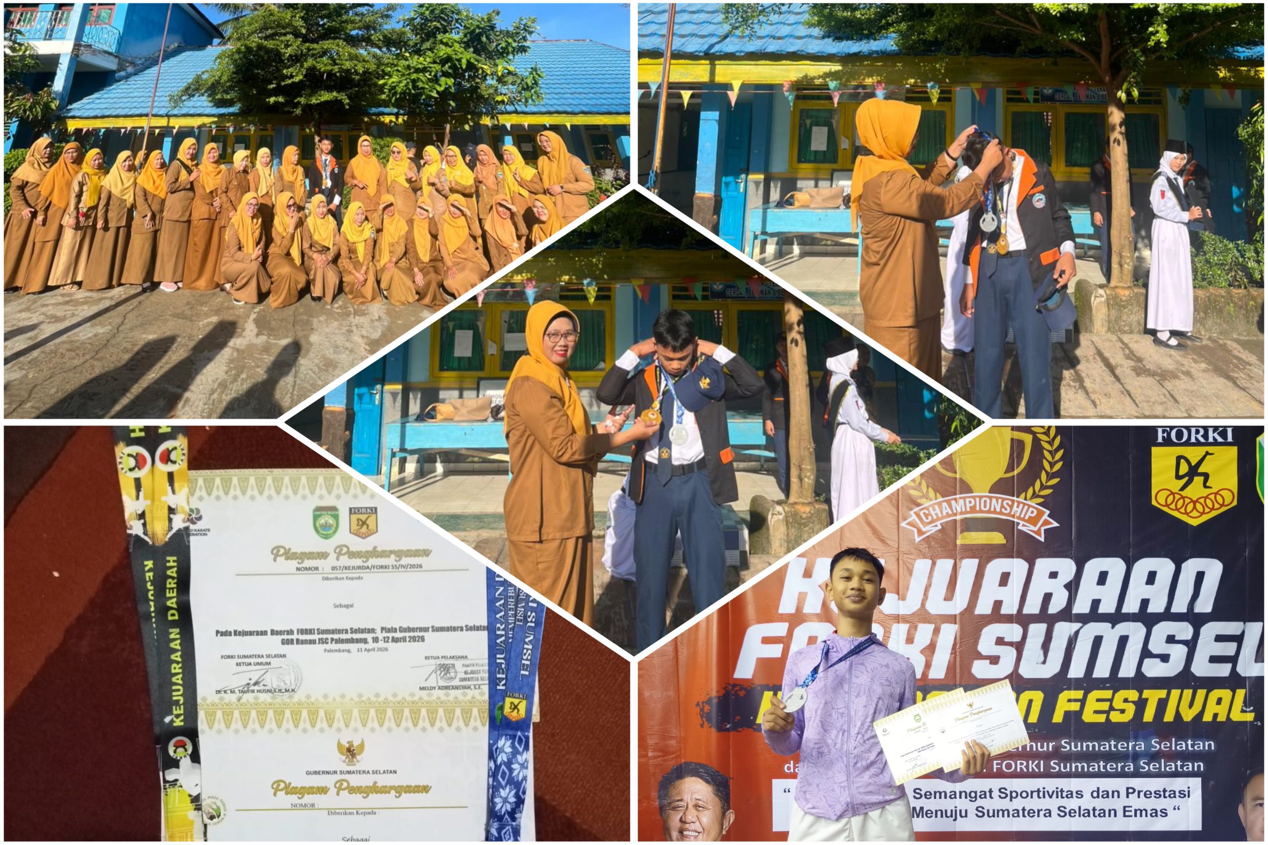 Di hadapan ratusan siswa dan dewan guru, Kepala Sekolah Sri Indrayani, S.Pd memberikan apresiasi langsung kepada salah satu siswa berprestasi, Ahmad Elang Perdana Al Aziz, yang sukses mengharumkan nama sekolah di ajang Kejuaraan Karate-Do FORKI Sumatera Selatan Piala Gubernur.